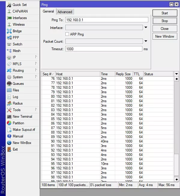 Ping test 100x met packet size 1000
