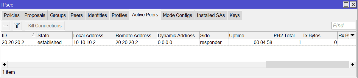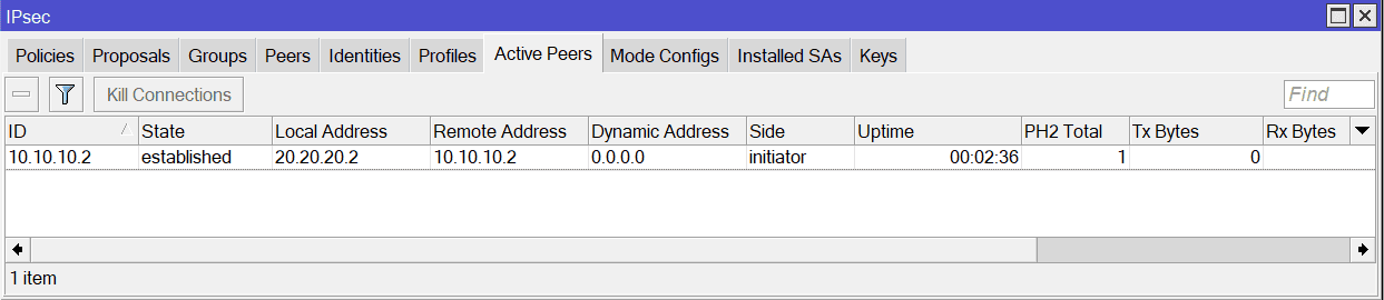 - Kijk in WinBox onder Active Peers/SAs of de tunnel up is.
