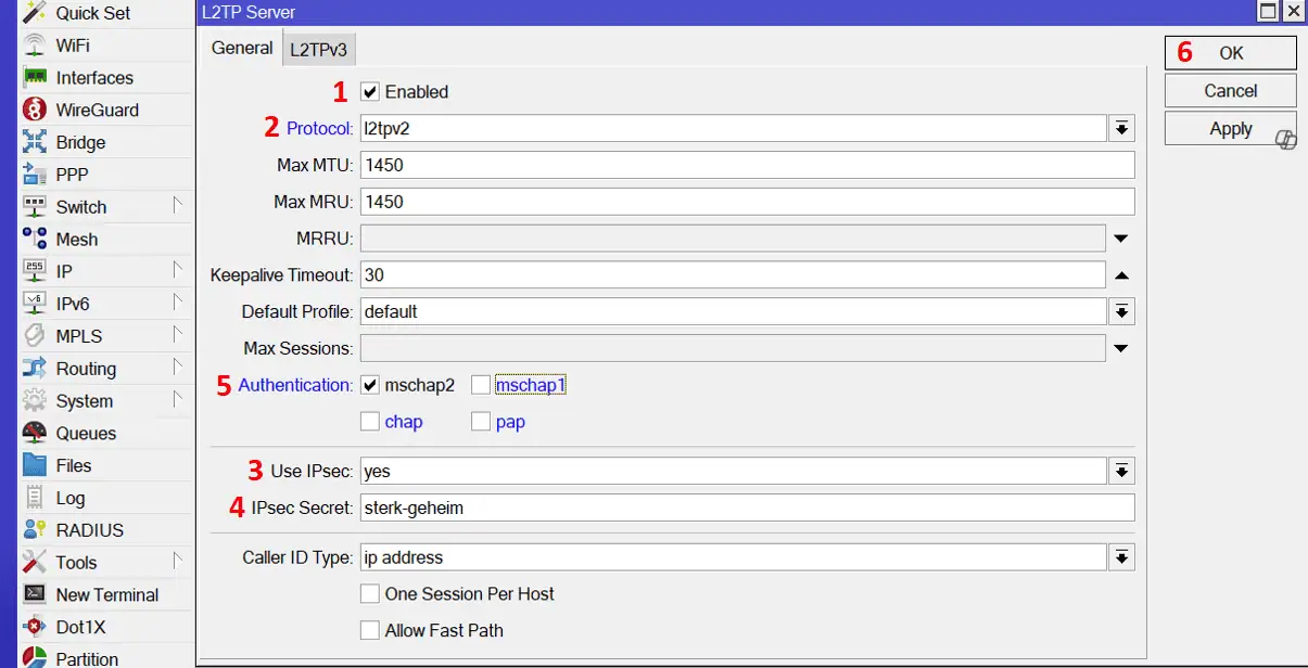 In MikroTik RouterOS zijn wachtwoorden (“password” bij PPP secrets, gebruikers en ook IPSec-secrets) maximaal 64 tekens lang. Als je een langer wachtwoord ingeeft, wordt het afgekapt op 64 karakters. Gebruik altijd een lang, uniek wachtwoord maar ga niet over de 64 karakters heen.