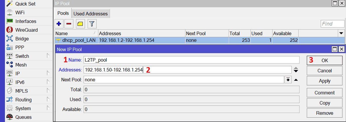 /ip firewall nat add chain=srcnat src-address=192.168.1.50-192.168.1.254 out-interface=ether1 action=masquerade comment="VPN-clients internet"