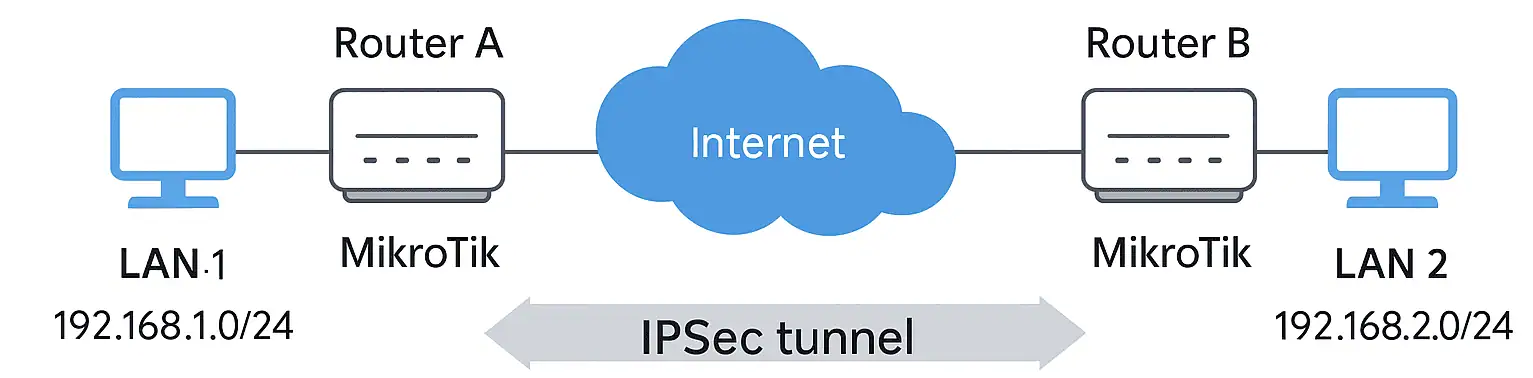 Op de afbeelding hierboven zie je een typische point-to-point IPSec tunnel tussen twee Mikrotik routers. Links heb je het lokale netwerk (LAN 1, bijvoorbeeld 192.168.1.0/24) dat via Router A verbinding maakt met het internet. Rechts zie je het tweede netwerk (LAN 2, bijvoorbeeld 192.168.2.0/24) achter Router B. De beveiligde verbinding, de IPSec tunnel loopt over het internet tussen beide Mikrotik routers. Alle verkeer tussen LAN 1 en LAN 2 wordt via deze tunnel versleuteld verstuurd. Voor de computers aan beide kanten werkt het alsof ze op één groot netwerk zitten, terwijl alles onderweg veilig blijft voor nieuwsgierige ogen. Zodra de tunnel actief is, kun je gewoon apparaten pingen of bestanden delen tussen beide locaties, alsof ze direct met elkaar verbonden zijn.