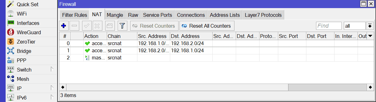 /ip firewall filter add chain=forward src-address=192.168.1.50-192.168.1.254 dst-address=192.168.1.0/24 action=accept comment="VPN naar LAN" add chain=forward src-address=192.168.1.0/24 dst-address=192.168.1.50-192.168.1.254 action=accept comment="LAN naar VPN"
