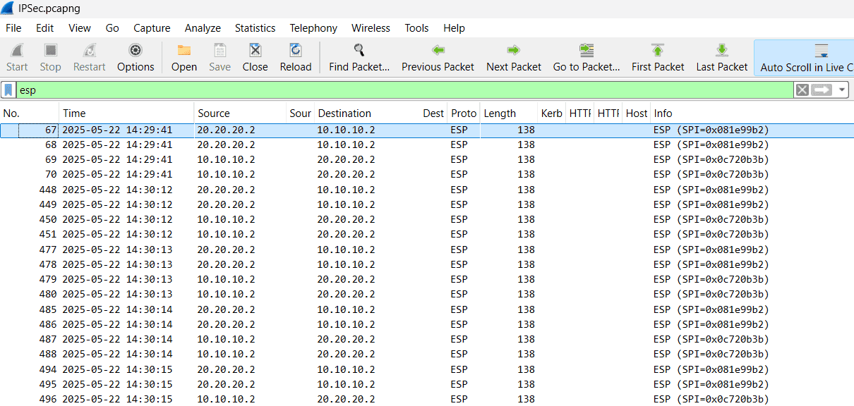 Gebruik het Wireshark filter udp.port == 4500 om NAT-T verkeer snel te vinden, of esp om ESP direct te detecteren.