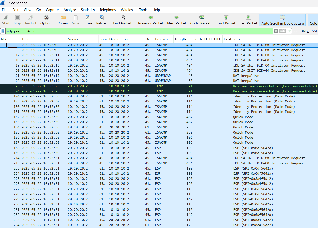 Met het Wireshark-filter udp.port == 4500 zie je alle relevante NAT-T pakketten zoals: