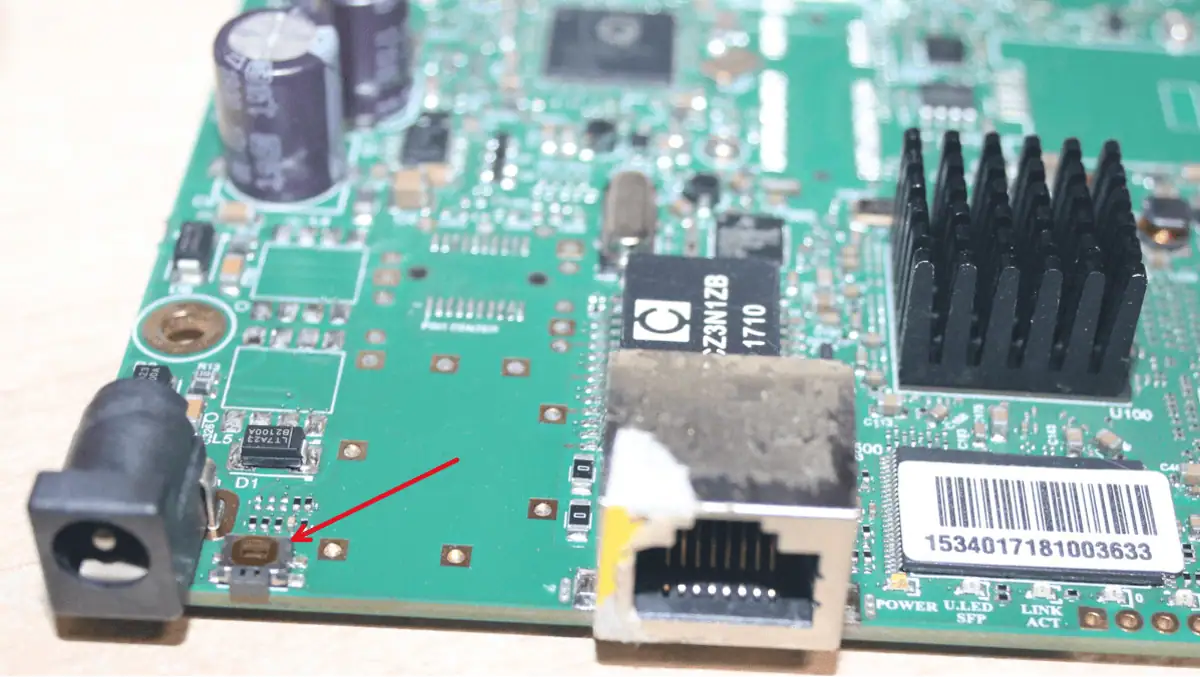 De resetknop op de printplaat van een Mikrotik router is erg klein en kwetsbaar. Zoals je op de foto ziet, zit de knop diep in de printplaat verwerkt. Als je te veel kracht gebruikt of met een scherp metalen voorwerp drukt, kun je het knopje makkelijk beschadigen of zelfs afbreken. Een defecte resetknop betekent meestal dat je de router niet meer eenvoudig kunt herstellen. Gebruik daarom altijd een kunststof of niet geleidend pinnetje, druk voorzichtig en voel goed of je het knopje indrukt zonder kracht te zetten.